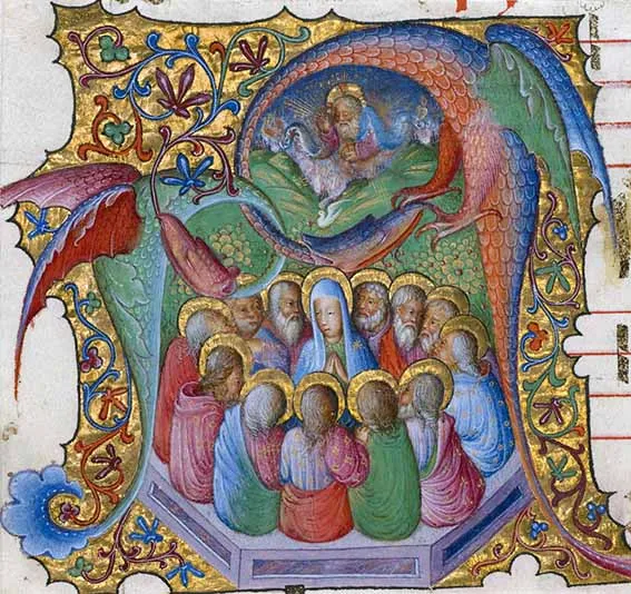«Sobre el Espíritu Santo nos dice san Lucas que después de la Ascensión del Señor descendió sobre los discípulos el día de Pentecostés, con poder sobre todas las naciones para introducirlos en la vida y abrirles el Nuevo Testamento: también los discípulos, animados del mismo sentimiento, celebraban en todas las lenguas las alabanzas de Dios, mientras que el Espíritu conducía a la unidad a las tribus separadas y ofrecían al Padre las primicias de todas las naciones.