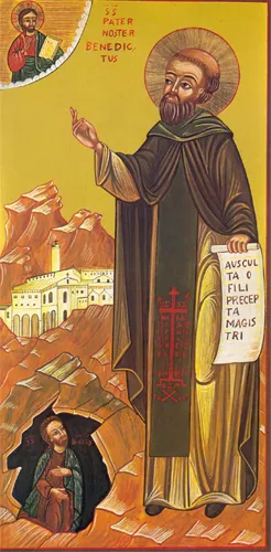 San Benito yendo a la escuela: Escolástica de Montecassino (hermana de san Benito), de pelo largo, de pie con la mano derecha levantada, detrás de Abundantia de Nurcia (madre de Benito), con redecilla, sentada en un banco, levantando la mano izquierda hacia Cirila de Nurcia (nodriza de Benito), cubierta con un velo. Esta sostenie un libro en la mano derecha, y extiende la mano izquierda hacia el niño Benito, que tiene sus manos levantadas y está en actitud de partir.