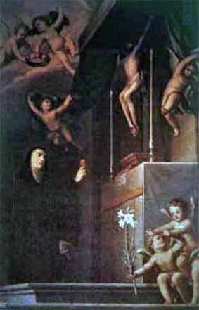 Santa Gertrudis ofreciendo su corazón a Cristo crucificado, óleo sobre tela, Nicolás Rodríguez Xuárez,